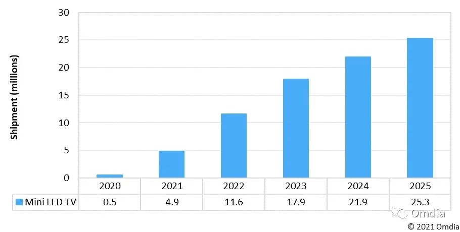 依据 Omdia 发布的最新猜测陈述,到2025年,mini LED背光电视的出货量估量将到达2500万台,占整个电视商场的10%。以下是具体内容: