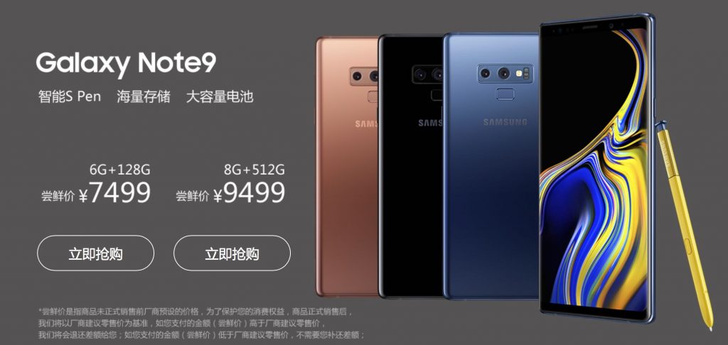 【更新】三星官网也放出了 Note 9 的国行价格(上图):6G+128G 版别尝鲜价为 7499 元,8G+512G 则为9499 元,色彩有铜、黑和蓝三种。
