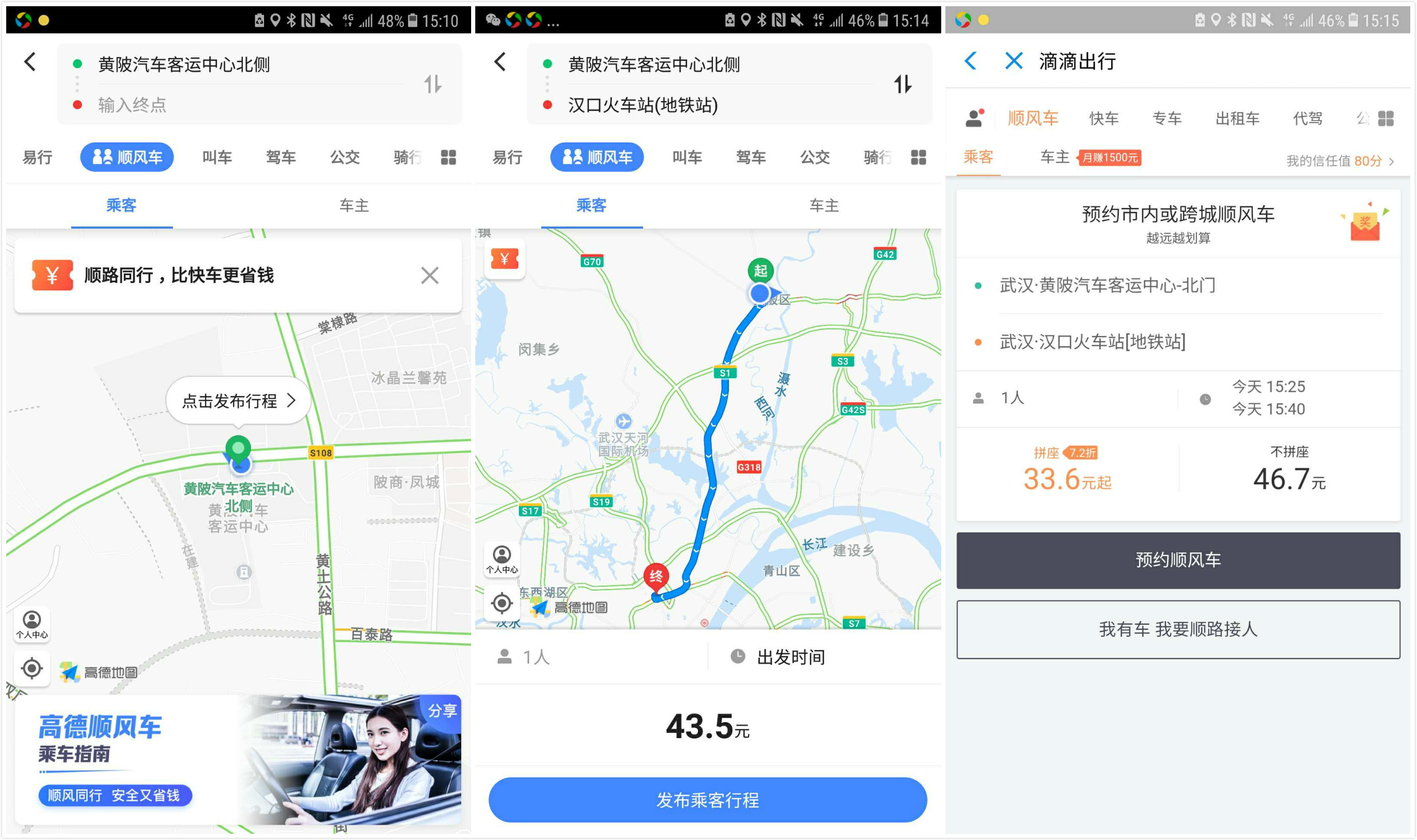 一位武汉的用户向动点科技泄漏,现在打开高德地图现已能够看到顺风车进口,可直接点击发布行程。以36公里的间隔为例,高德地图预估费用仅位43.5元,的确比出租车和网约车廉价不少。不过滴滴自身也有顺风车事务,同一间隔滴滴的预估费用为46.7元,而拼座的费用只要33.6元,距离看起来并不大。