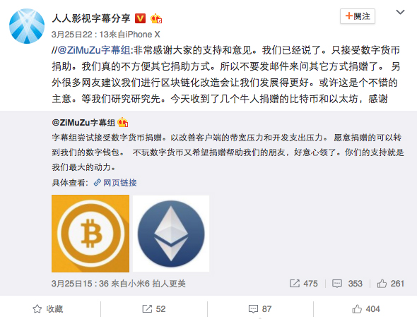 附上了承受捐款的比特币、以太坊和比特币钱包的地址。人人影视还在今日共享了一条有关数字钱银的科普文章。