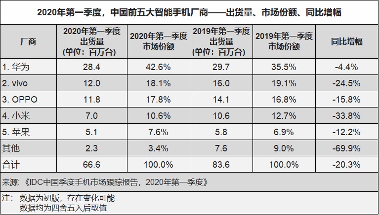 IDC:2020 Q1 我国智能手机出货量约 6660 万台,5G 机型占 22%